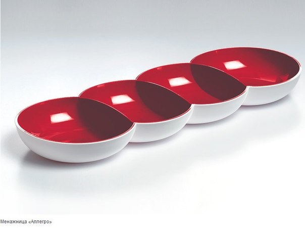 Менажница состоит из 4 чаш круглой обтекаемой формы, 2 из которых имеют объём 290 мл, а 2 других - 260 мл. Изделие имеет слегка шероховатую поверхность белого цвета снаружи и гладкую сияющую внутреннюю часть вишневого цвета.