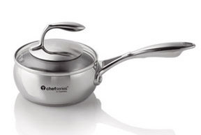 Толстые стенки ковша, массивное трехслойное дно и плотно прилегающая крышка делают возможным приготовление пищи с минимальным количеством масла и воды.