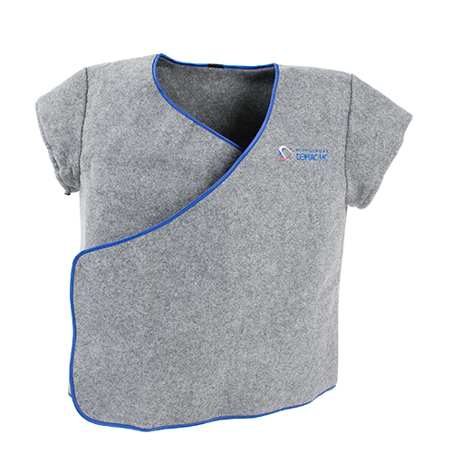 Лечебный жилет изготовлен из нескольких слоев. Внешние выполнены из синтетического полотна, а внутренний - из тонких синтетических металлизированных пленок, которые выполняют функцию защитного экрана. Это позволяет уменьшить конвекционные теплопотери организма, а также снизить интенсивность воздействия внешнего электромагнитного излучения.