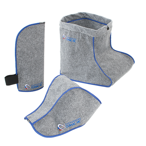 Лечебные сапог, рукавицы и шапочка изготовлены из нескольких слоев. Внешние выполнены из синтетического полотна, а внутренний - из тонких синтетических металлизированных пленок, которые выполняют функцию защитного экрана. Это позволяет уменьшить конвекционные теплопотери организма, а также снизить интенсивность воздействия внешнего электромагнитного излучения.