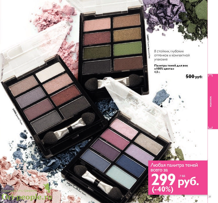 Тени можно наносить на веки, входящим в комплект двухсторонним аппликатором, с использованием сухого или влажного способа нанесения. Влажный способ рекомендуется для увеличения интенсивности насыщенности оттенка, наносимых теней.