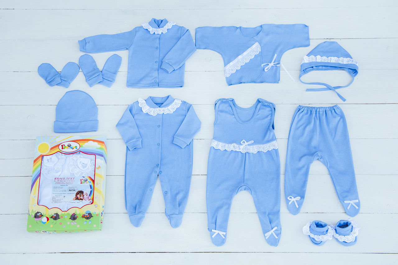 Комбинезон, кофточка, чепчик, ползунки длинные, ползунки короткие, рукавички, носки, распашонка, шапочка, пинетки. Интерлок гладкокрашеный
