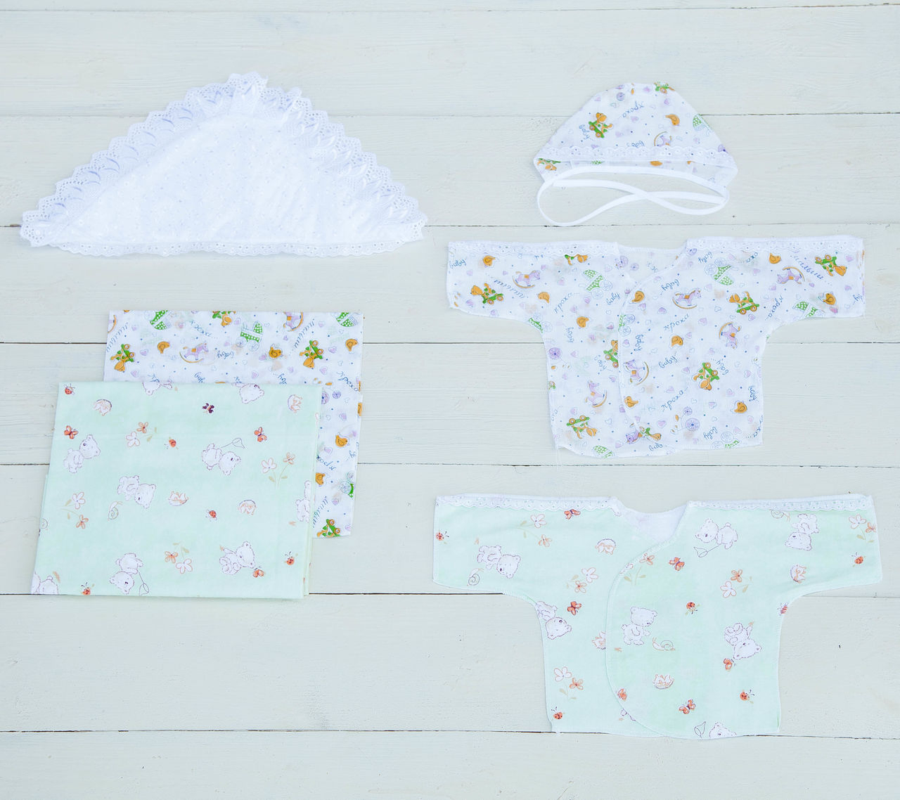 Уголок 80*80, пелёнка тёплая, пелёнка лёгкая, распашонка лёгкая, распашонка тёплая, чепчик лёгкий