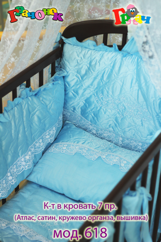 Пододеяльник 110*140, простыня 100*150, наволочка 40*60, одеяло 110*140, подушка 40*60, борт (раздельный), балдахин