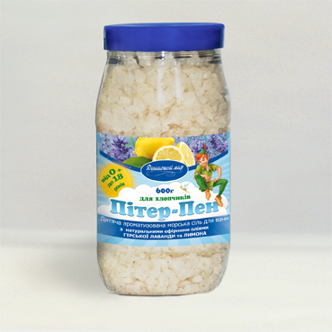 Детская ароматизированная морская соль для ванн с натуральными эфирными маслами горной лаванды и лимона.