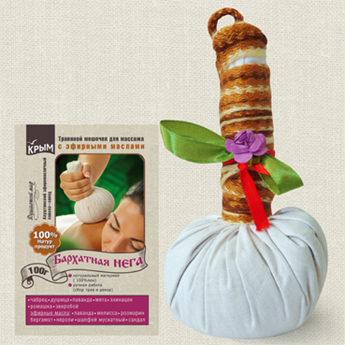 Применение: перед массажем мешочек обдается кипятком для эффекта запаривания трав и активации эфирных масел. Мешочек также можно настоять на массажном масле и перед применением подогреть