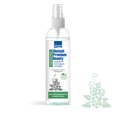 Состав: гидролат розмарина, гидролат календулы, гидролат шалфея. Не содержит спирта и консервантов. Гидролаты Алуштинского эфиромасличного совхоз-завода производятся с использованием воды Чатыр-Дагской с источника Хачи- Iвулканического масива Чатыр-Даг.