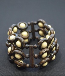 Оригинальный дизайн - отличительная особенность этого уникального украшения. Браслет совсем не похож на классические модели браслетов, которыми переполнены магазины: три ряда колец из древесины дуба, в центре которых расположились миниатюрные шарики из граба, соединяются между собой с помощью тонкой планки.