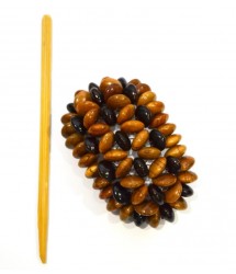 Заколка состоит из небольших, аккуратных бусинок, нанизанных на прочную леску и образующих символичные цветы. В дизайне данной модели за счет контрастности используемой древесины особенно выделяются три ряда бусинок из вишни, которые визуально вытягивают аксессуар.
