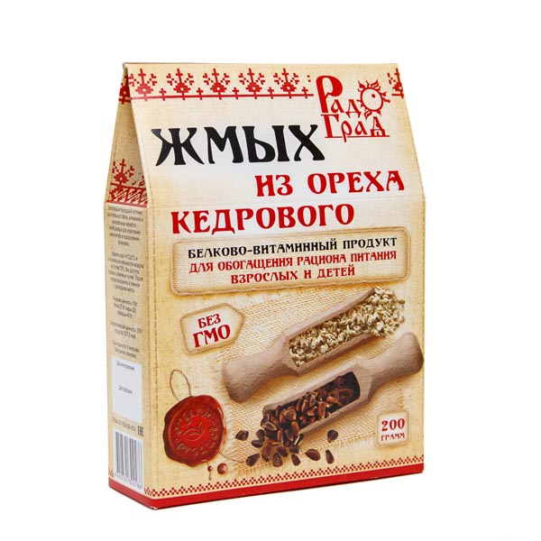 В кедровом жмыхе здоровья ничуть не меньше. Он выводит из организма шлаки, помогает при ослабленном иммунитете, аллергии, заболеваниях крови и ЖКТ. Также его рекомендуют страдающим туберкулезом. Жмых полезен для малышей, для беременных и кормящих женщин.
