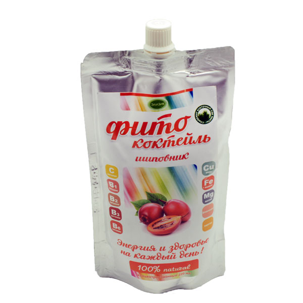 Фитококтейль шиповниковый содержит: С, Е, В1, В2, РР, К, каротин, калий, натрий, кальций, магний, фосфор, железо, медь, цинк, флавоноиды, мальтол, пектины.