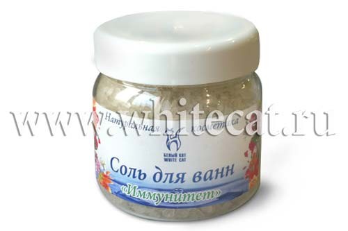 Соль для ванн Иммунитет от компании БЕЛЫЙ КОТ - превосходное средство, питающее витаминами вашу кожу, с великолепным набором трав, являющихся природным стимулятором организма. Соль с целебными дикорастущими сибирскими травами, издавна известными своими полезными свойствами, снимет напряжение, эффективно очистит и разгладит кожу, подарит наслаждение и добавит сил и жизненной энергии вашему телу.