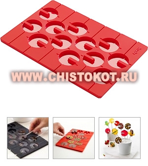 Формочка рассчитана на одновременное производство 12 объемных конфет. Силиконовый лист имеет 12 соответствующих отделов, к каждому из которых проложен желобок для размещения в нем палочек.