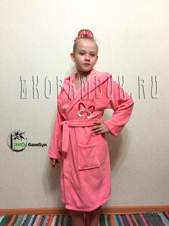На девочек с 4 до 8 лет халатик с ушками и кошкой, для тех кто постарше - обычный капюшончик и с бабочкой.