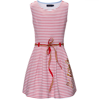 Платье отрезное по талии, юбка со складками украшена крупным принтом с золотым якорем.