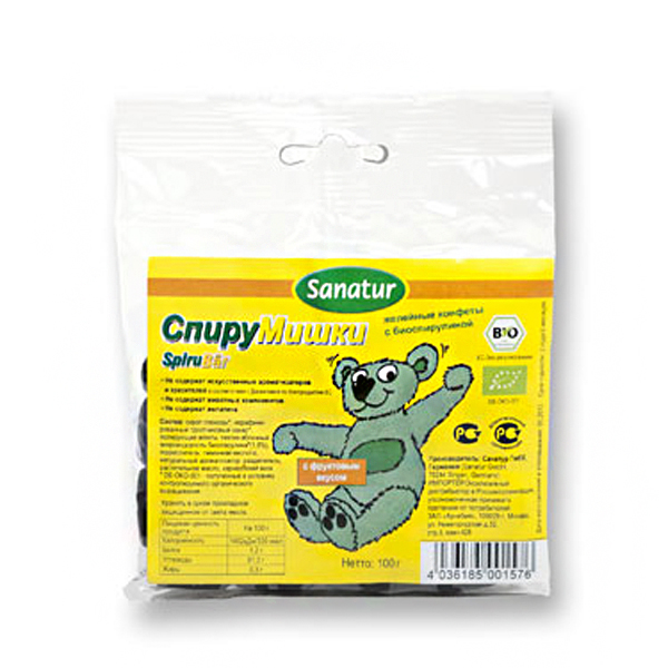 Состав: сироп глюкозы, нерафинированный тростниковый сахар, желирующие агенты: пектин яблочный; микроводоросль биоспирулина (1,8%), подкислитель: лимонная кислота; натуральный ароматизатор, разделитель: растительное масло, карнаубский воск.