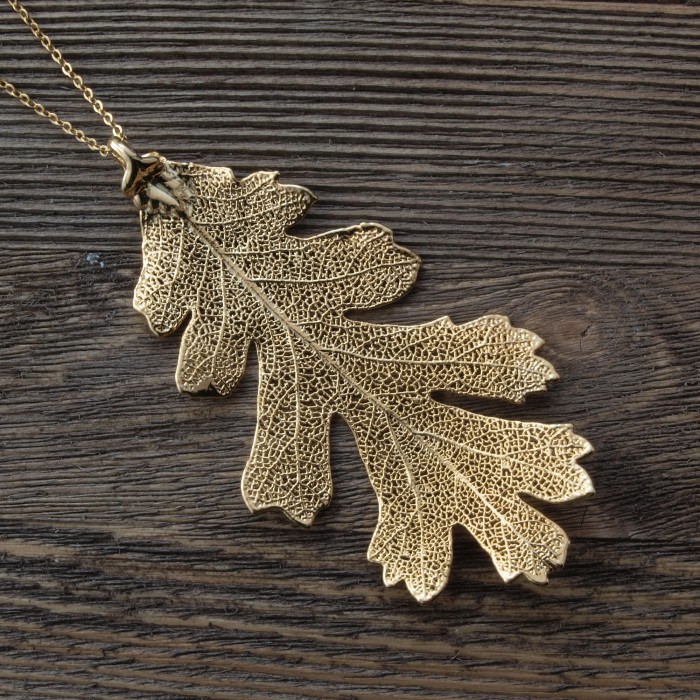 Кулон изготовлен на основе натурального листа дуба с гальваническим покрытием золотом 24 карат.