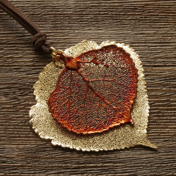 Кулон изготовлен на основе натурального листа осины с гальваническим покрытием медью и золотом 24 карат.