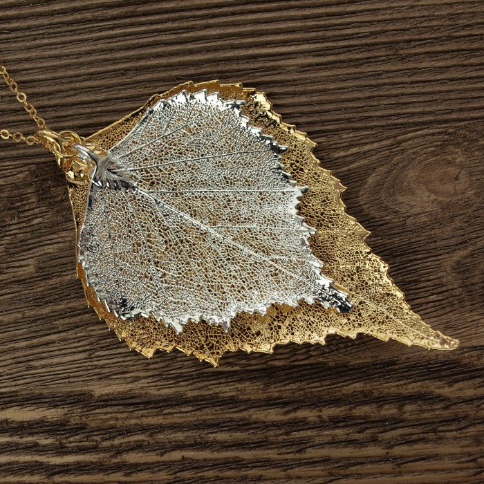 Кулон изготовлен на основе натурального листа березы с гальваническим покрытием серебром и золотом 24 карат.