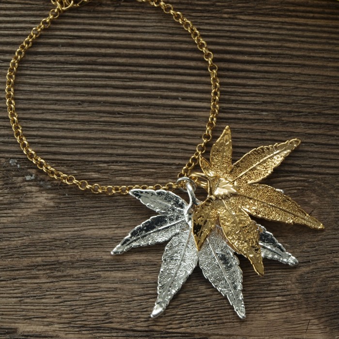 Браслет изготовлен на основе натурального листа японского клена с гальваническим покрытием золотом 24 карат и серебром.