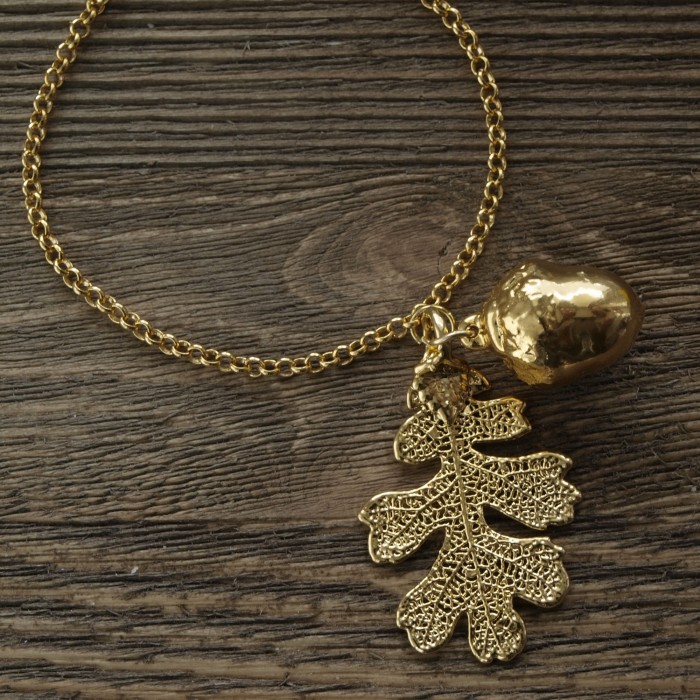 Браслет изготовлен на основе натурального листа дуба и желудя с гальваническим покрытием золотом 24 карат.
