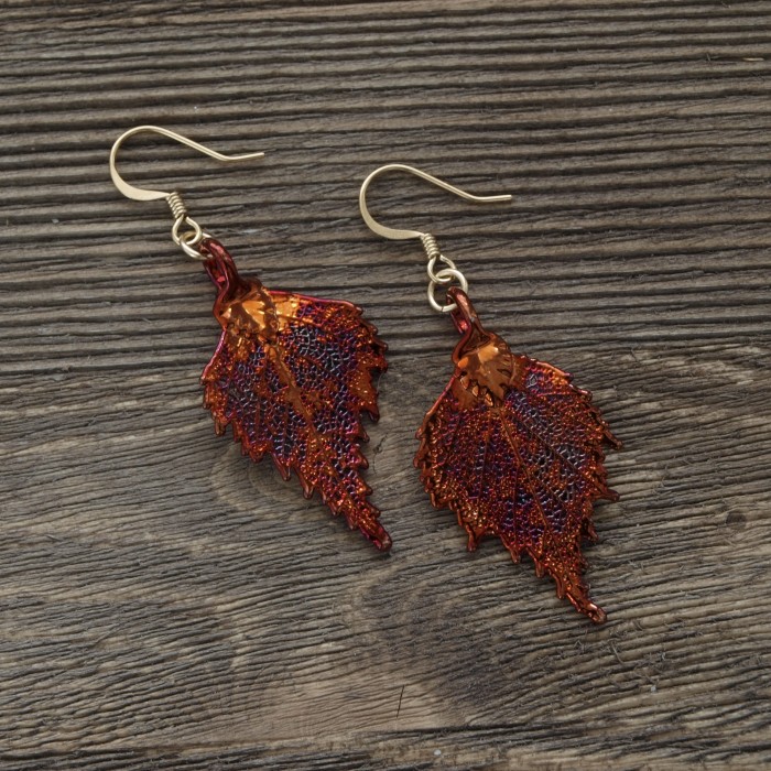 Серьги изготовлены на основе натурального листа березы с гальваническим покрытием медью.