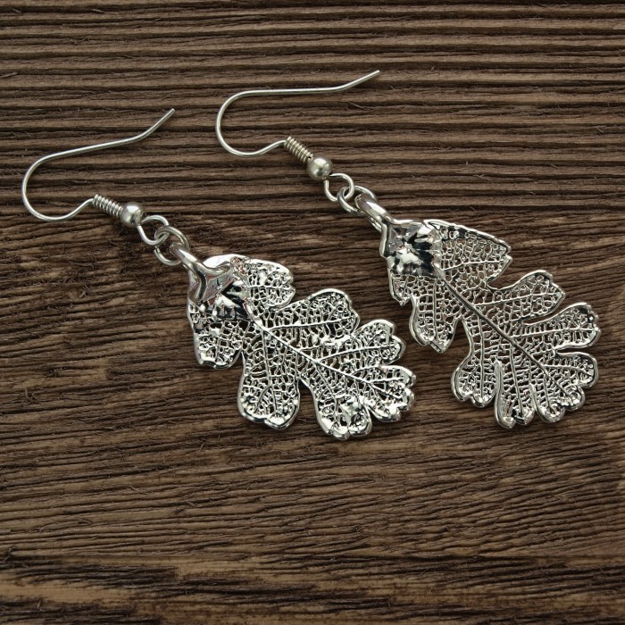 Серьги изготовлены на основе натурального листа дуба с гальваническим покрытием серебром.