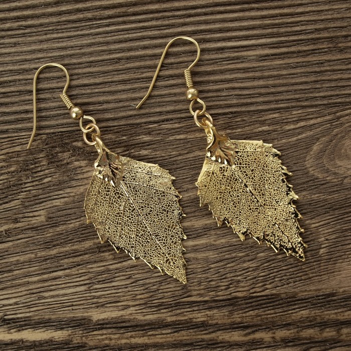 Серьги изготовлены на основе натурального листа березы с гальваническим покрытием золотом 24 карат.