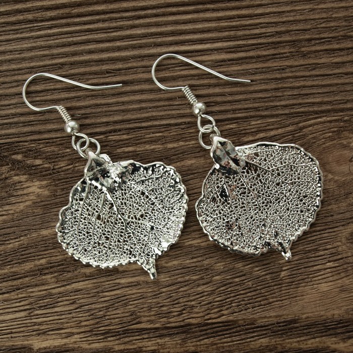 Серьги изготовлены на основе натурального листа осины с гальваническим покрытием серебром.