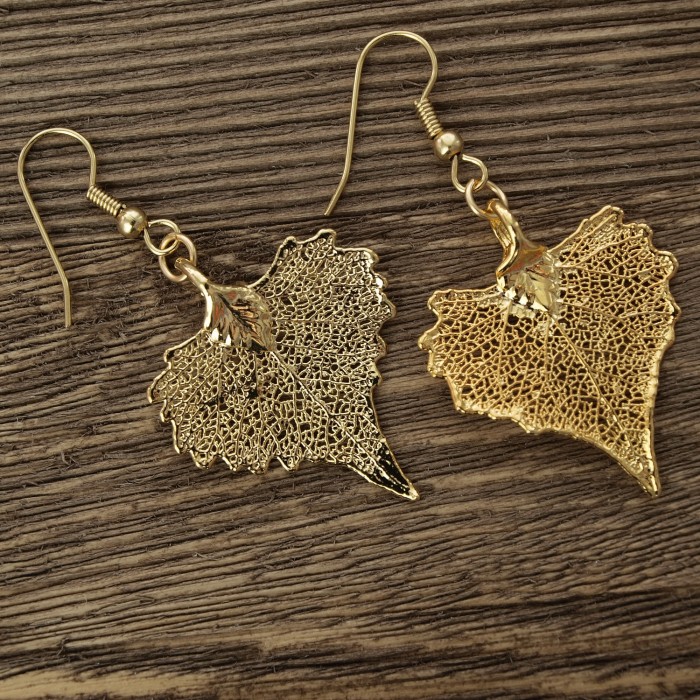 Серьги изготовлены на основе натурального листа тополя с гальваническим покрытием золотом 24 карат.