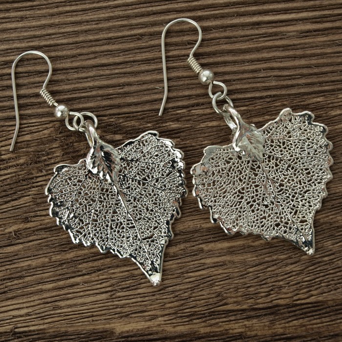 Серьги изготовлены на основе натурального листа тополя с гальваническим покрытием серебром.