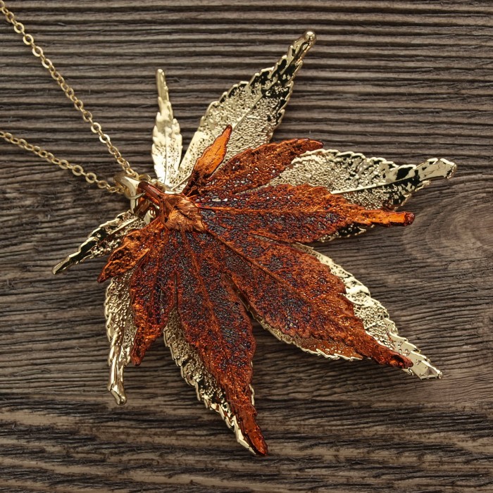 Кулон изготовлен на основе натурального листа японского клена с гальваническим покрытием меди и золотом 24 карат.