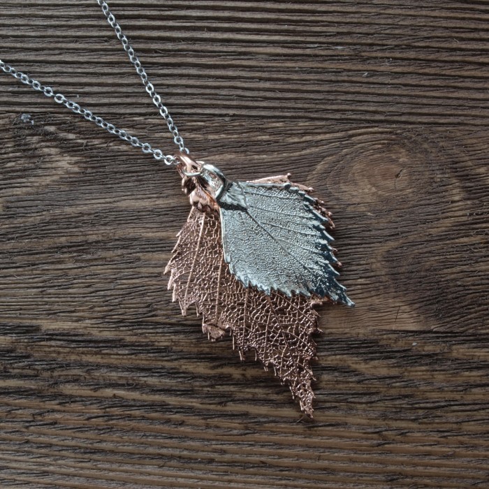 Кулон изготовлен на основе натурального листа березы с гальваническим покрытием серебром и золотом 24 карат.