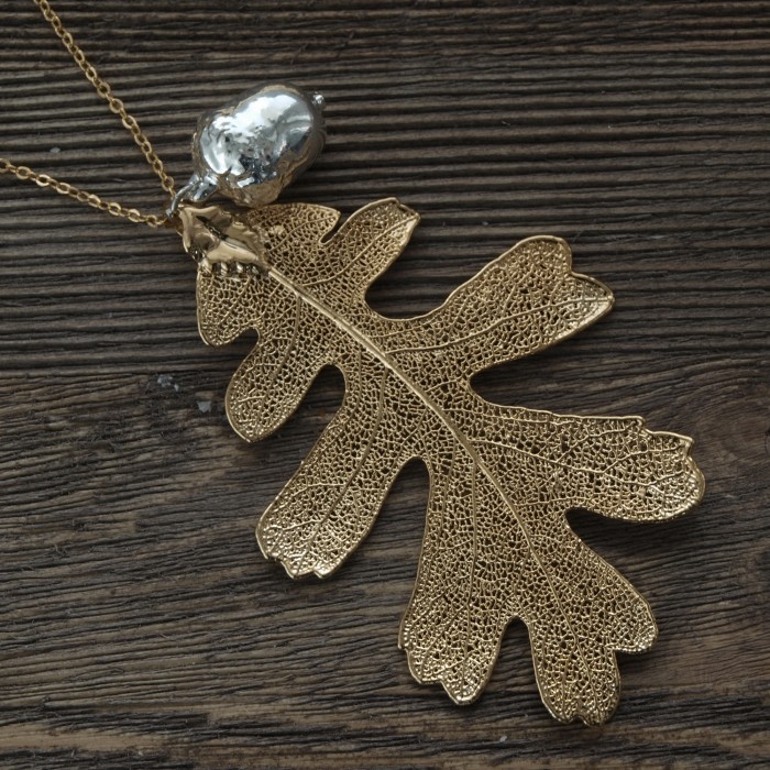 Кулон изготовлен на основе натурального листа дуба и желудя с гальваническим покрытием золотом 24 карат и серебром.