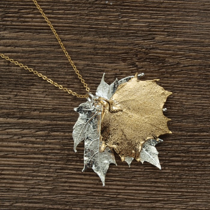 Кулон изготовлен на основе натурального листа канадского клена с гальваническим покрытием серебром и золотом 24 карат.