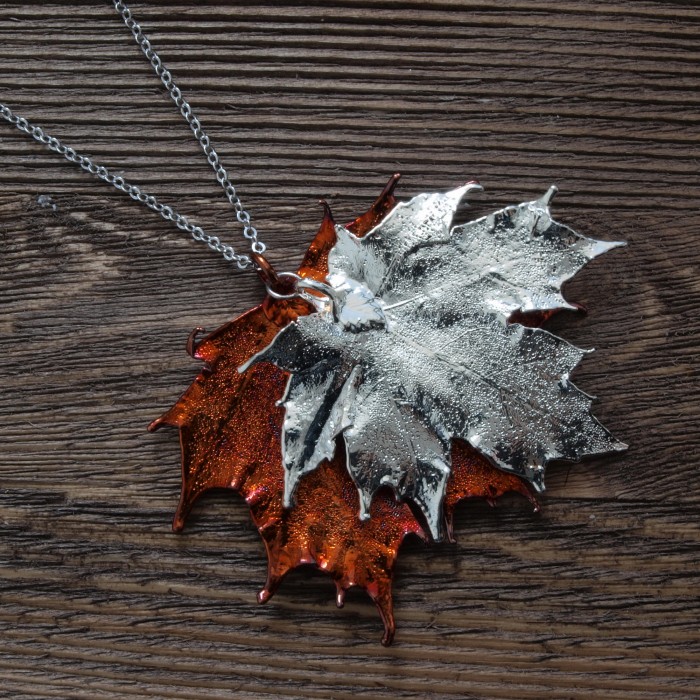 Кулон изготовлен на основе натурального листа канадского клена с гальваническим покрытием серебром и золотом 24 карат.