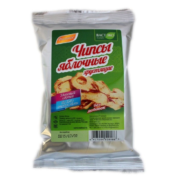 Основой для фитнес чипсов стал самый популярный и полезный в мире фрукт - яблоко. С одной стороны, это не просто сушеные яблоки, так как они, как и все чипсы, очень аппетитно хрустят, а с другой стороны, благодаря щадящей термообработке в них содержится вся польза свежих яблок, и даже легкая яблочная кислинка добавляет чипсам свежую нотку.