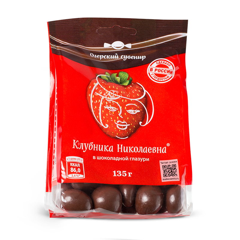 Специально подготовленная клубника сохраняет естественный вкус и запах, поэтому с ней кусочек лета привносится в любое время года. Благодаря шоколадной глазури клубника становится насыщеннее и слаще, приобретая бархатистый нежный вкус. Клубника Николаевна - конфетка, собравшая в себе полезные свойства клубники. Говорят, она укрепляет иммунитет, подавляет развитие гриппа и содержит не меньше витамина С, чем апельсины.