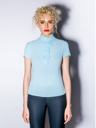 Блузка из крепа прилегающего силуэта, с коротким рукавом. Воротник стойка со сгибом, выкроена "по - косой". Застежка на спине на "потайную" молнию. Из под воротника по центру груди декоративный волан. По боковым швам внизу разрезы длиной 6 см.