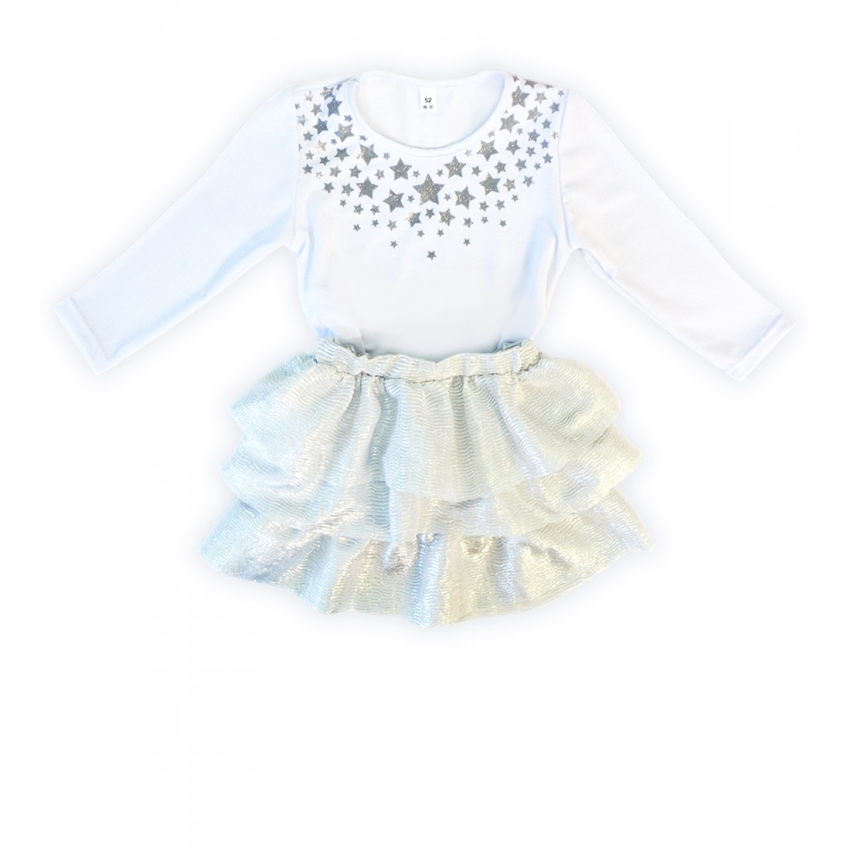 Костюм для девочки от MODESTREET состоит из блестящей юбки с оборками и лонгслива с длиной рукава 3/4