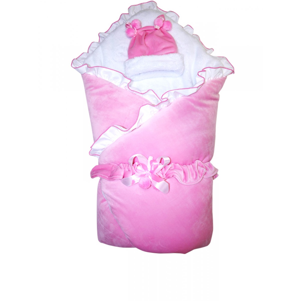 В набор входят: теплое одеялко с отделкой рюша ( верх велюр, внутри велсофт), теплая шапочка с украшением, пояс на резинке с украшением
