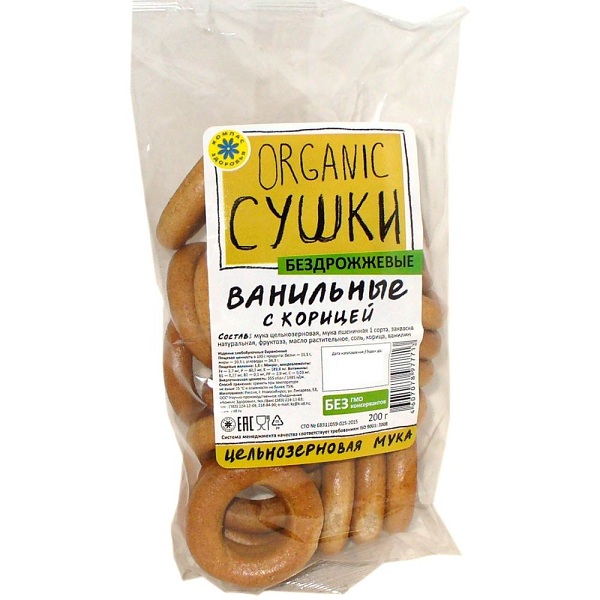 Состав: мука цельнозерновая, мука пшеничная (первый сорт), закваска натуральная, фруктоза, масло растительное, соль, корица, ванилин.