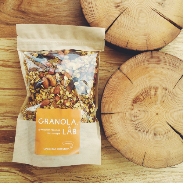 Состав: цельные овсяные хлопья, кунжут, миндаль, пекан, кешью, семена подсолнечника, тёмная курага, изюм, корица, мёд сибирский, яблочное пюре, без сахара. Пищевая ценность в 100 г: Белки: 13 г, Жиры: 25 г, Углеводы: 43 гр. Энергетическая ценность в 100 г: 430 Ккал. Срок годности: 6 месяцев.