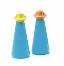 В набор входят два небольших конусообразных контейнера бирюзового цвета с цветными крышечками-клапанами и желтая подставка. Изделия выполнены из непрозрачного полимера.